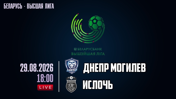 29 августа 2026 года, мы предлагаем посмотреть онлайн трансляцию футбольного матча между футбольным клубом Днепр Могилев и футбольным клубом Ислочь, проходящего в рамках Высшей лиги Беларуси.