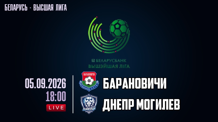 5 сентября 2026 года, мы предлагаем посмотреть онлайн трансляцию футбольного матча между футбольным клубом Барановичи и футбольным клубом Днепр Могилев, проходящего в рамках Высшей лиги Беларуси.