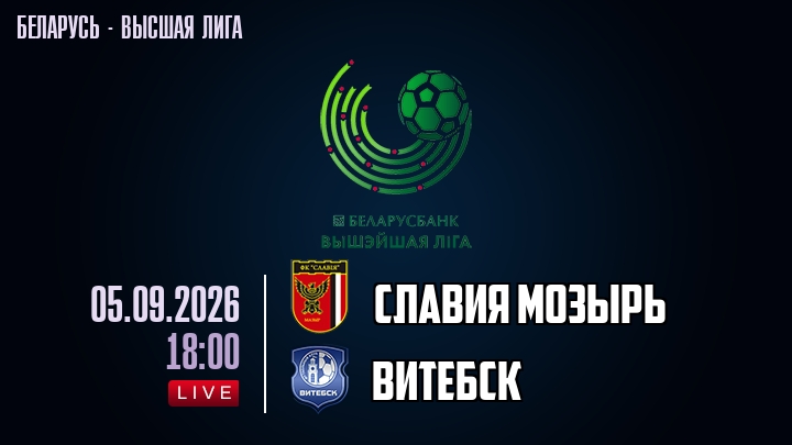 5 сентября 2026 года, мы предлагаем посмотреть онлайн трансляцию футбольного матча между футбольным клубом Славия Мозырь и футбольным клубом Витебск, проходящего в рамках Высшей лиги Беларуси.