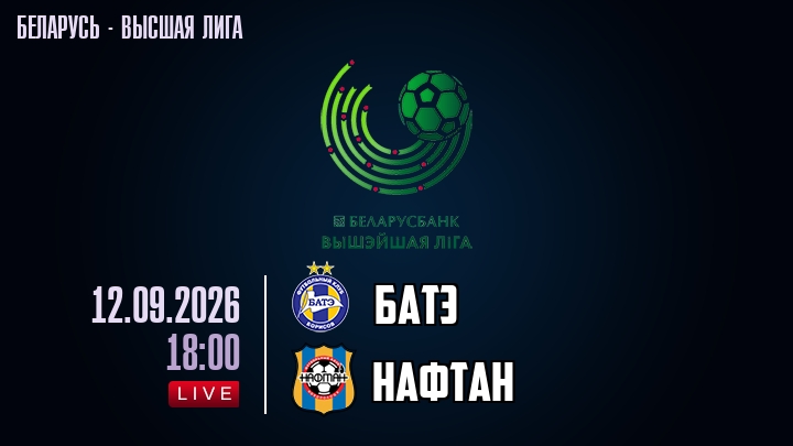 12 сентября 2026 года, мы предлагаем посмотреть онлайн трансляцию футбольного матча между футбольным клубом БАТЭ и футбольным клубом Нафтан, проходящего в рамках Высшей лиги Беларуси.
