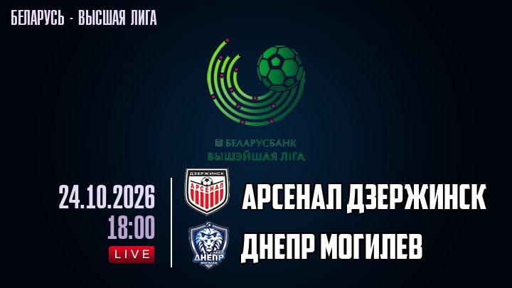 24 октября 2026 года, мы предлагаем посмотреть онлайн трансляцию футбольного матча между футбольным клубом Арсенал Дзержинск и футбольным клубом Днепр Могилев, проходящего в рамках Высшей лиги Беларуси.