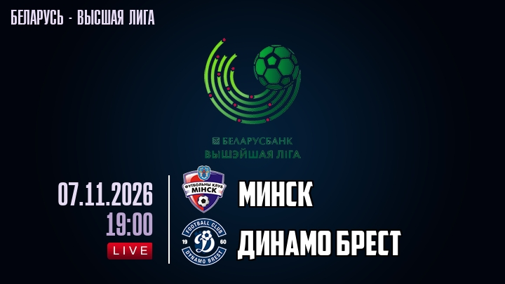 7 ноября 2026 года, мы предлагаем посмотреть онлайн трансляцию футбольного матча между футбольным клубом Минск и футбольным клубом Динамо Брест, проходящего в рамках Высшей лиги Беларуси.