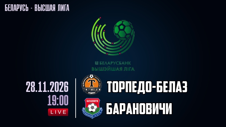 28 ноября 2026 года, мы предлагаем посмотреть онлайн трансляцию футбольного матча между футбольным клубом Торпедо-БелАЗ и футбольным клубом Барановичи, проходящего в рамках Высшей лиги Беларуси.