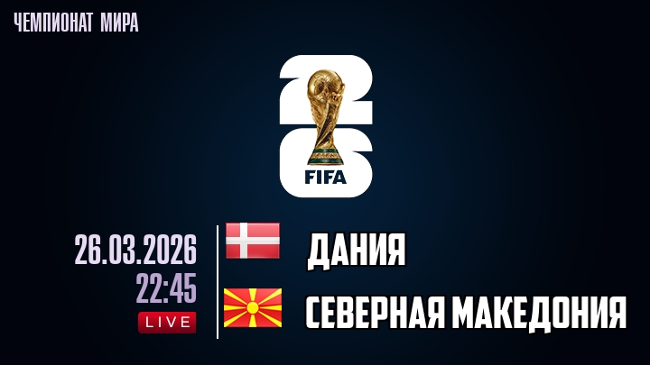 26 марта 2026 года, мы предлагаем посмотреть онлайн трансляцию футбольного матча между сборной Дании и сборной Северная Македония, проходящего в рамках Чемпионата мира по футболу.