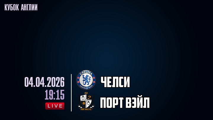 4 апреля 2026 года, мы предлагаем посмотреть онлайн трансляцию футбольного матча между футбольным клубом Челси и футбольным клубом Порт Вэйл, проходящего в рамках Кубка Англии.