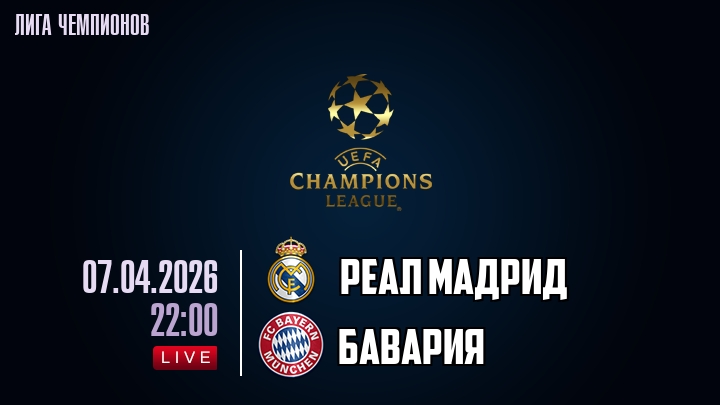 7 апреля 2026 года, мы предлагаем посмотреть онлайн трансляцию футбольного матча между футбольным клубом Реал Мадрид и футбольным клубом Бавария, проходящего в рамках Лиги Чемпионов.