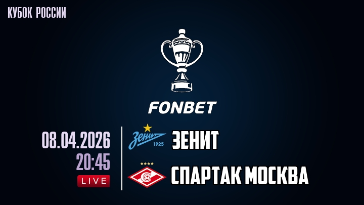 8 апреля 2026 года, мы предлагаем посмотреть онлайн трансляцию футбольного матча между футбольным клубом Зенит и футбольным клубом Спартак Москва, проходящего в рамках Кубка России.