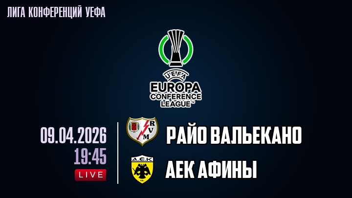 9 апреля 2026 года, мы предлагаем посмотреть онлайн трансляцию футбольного матча между футбольным клубом Райо Вальекано и футбольным клубом АЕК Афины, проходящего в рамках Лиги конференций УЕФА.