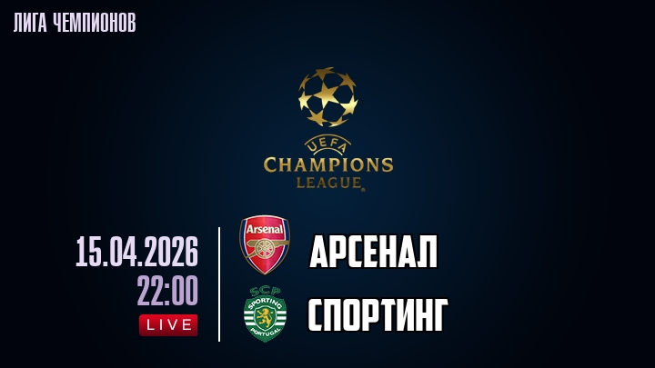 15 апреля 2026 года, мы предлагаем посмотреть онлайн трансляцию футбольного матча между футбольным клубом Арсенал и футбольным клубом Спортинг, проходящего в рамках Лиги Чемпионов.