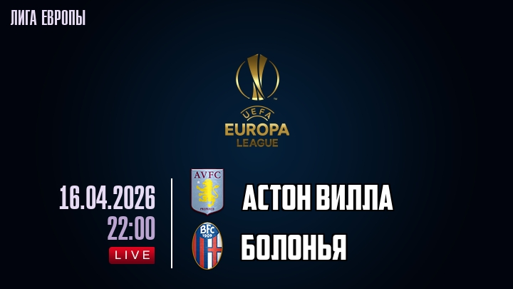 16 апреля 2026 года, мы предлагаем посмотреть онлайн трансляцию футбольного матча между футбольным клубом Астон Вилла и футбольным клубом Болонья, проходящего в рамках Лиги Европы.