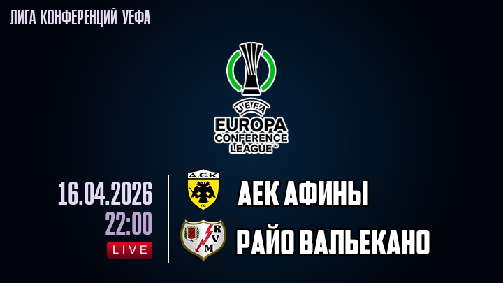 16 апреля 2026 года, мы предлагаем посмотреть онлайн трансляцию футбольного матча между футбольным клубом АЕК Афины и футбольным клубом Райо Вальекано, проходящего в рамках Лиги конференций УЕФА.
