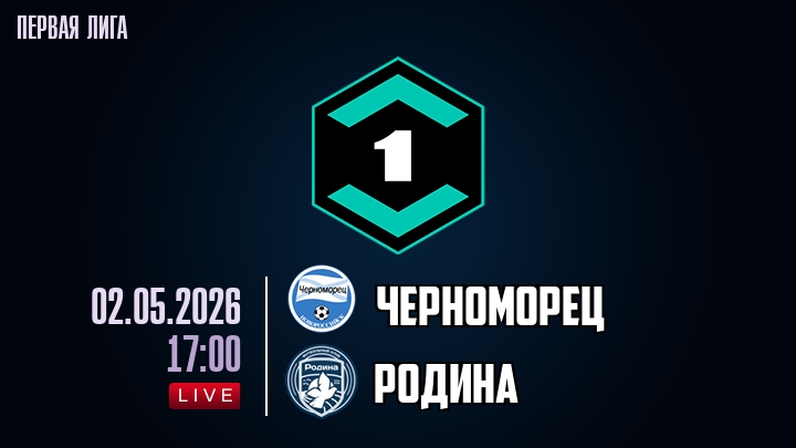 2 мая 2026 года, мы предлагаем посмотреть онлайн трансляцию футбольного матча между футбольным клубом Черноморец и футбольным клубом Родина, проходящего в рамках Первой лиги.