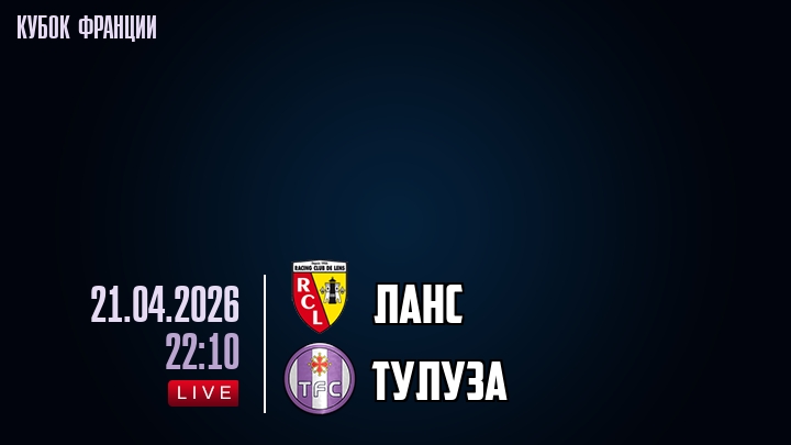 21 апреля 2026 года, мы предлагаем посмотреть онлайн трансляцию футбольного матча между футбольным клубом Ланс и футбольным клубом Тулуза, проходящего в рамках Кубка Франции.