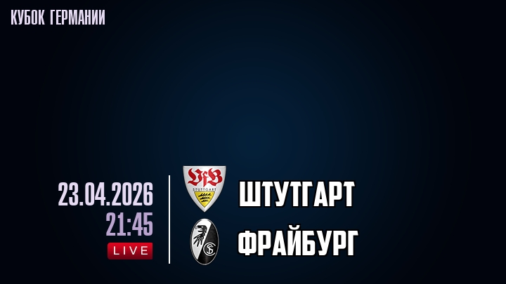 23 апреля 2026 года, мы предлагаем посмотреть онлайн трансляцию футбольного матча между футбольным клубом Штутгарт и футбольным клубом Фрайбург, проходящего в рамках Кубка Германии.