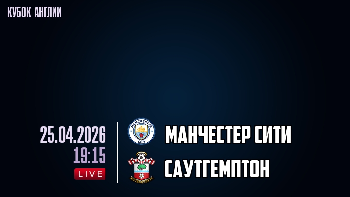 25 апреля 2026 года, мы предлагаем посмотреть онлайн трансляцию футбольного матча между футбольным клубом Манчестер Сити и футбольным клубом Саутгемптон, проходящего в рамках Кубка Англии.