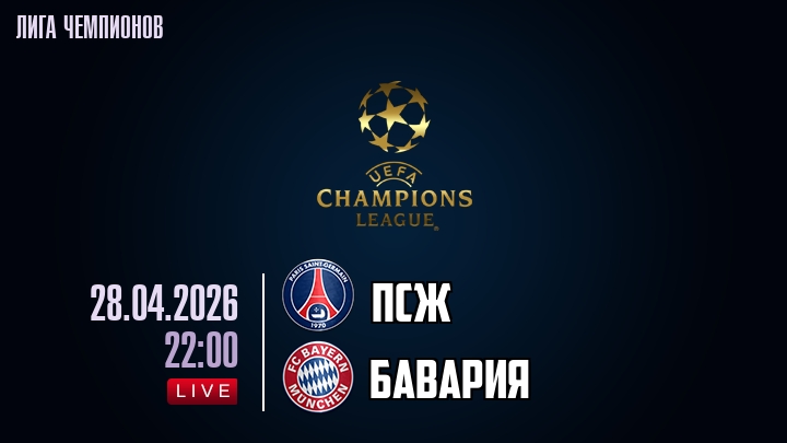 28 апреля 2026 года, мы предлагаем посмотреть онлайн трансляцию футбольного матча между футбольным клубом ПСЖ и футбольным клубом Бавария, проходящего в рамках Лиги Чемпионов.
