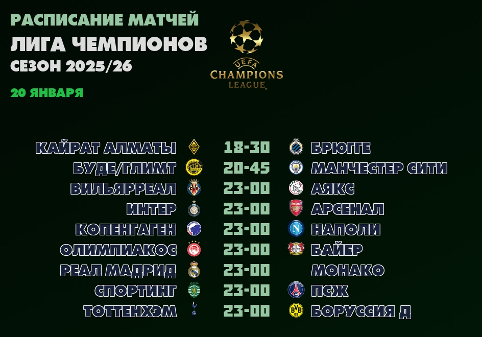 20 января 📺 ближайшие трансляции Лиги Чемпионов: ✔18-30 Кайрат Алматы - Брюгге, ✔20-45 Буде/Глимт - Манчестер Сити, ✔23-00 Вильярреал - Аякс, ✔23-00 Интер - Арсенал...
