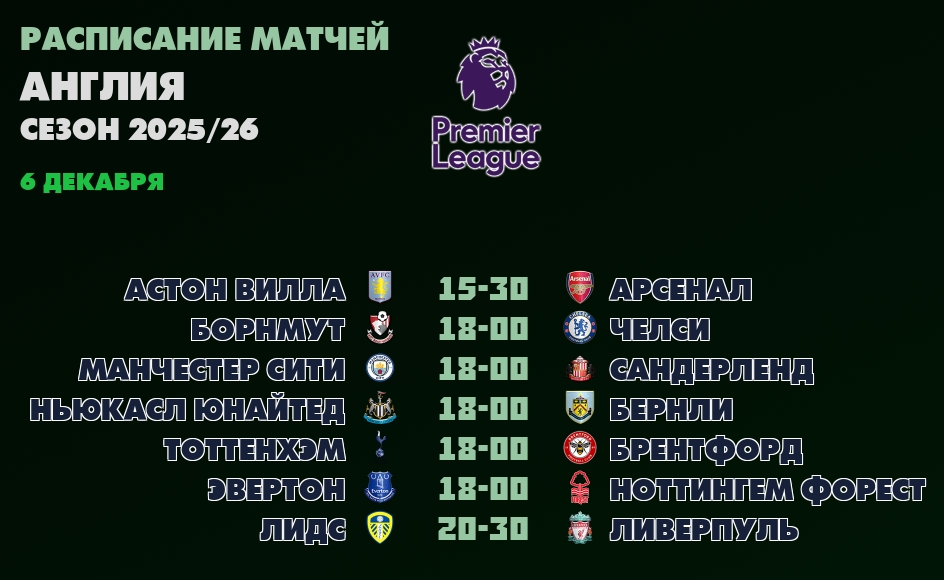 6 декабря 📺 ближайшие трансляции Премьер лиги Англии: ✔15-30 Астон Вилла - Арсенал, ✔18-00 Борнмут - Челси, ✔18-00 Манчестер Сити - Сандерленд, ✔18-00 Ньюкасл Юнайтед - Бернли...