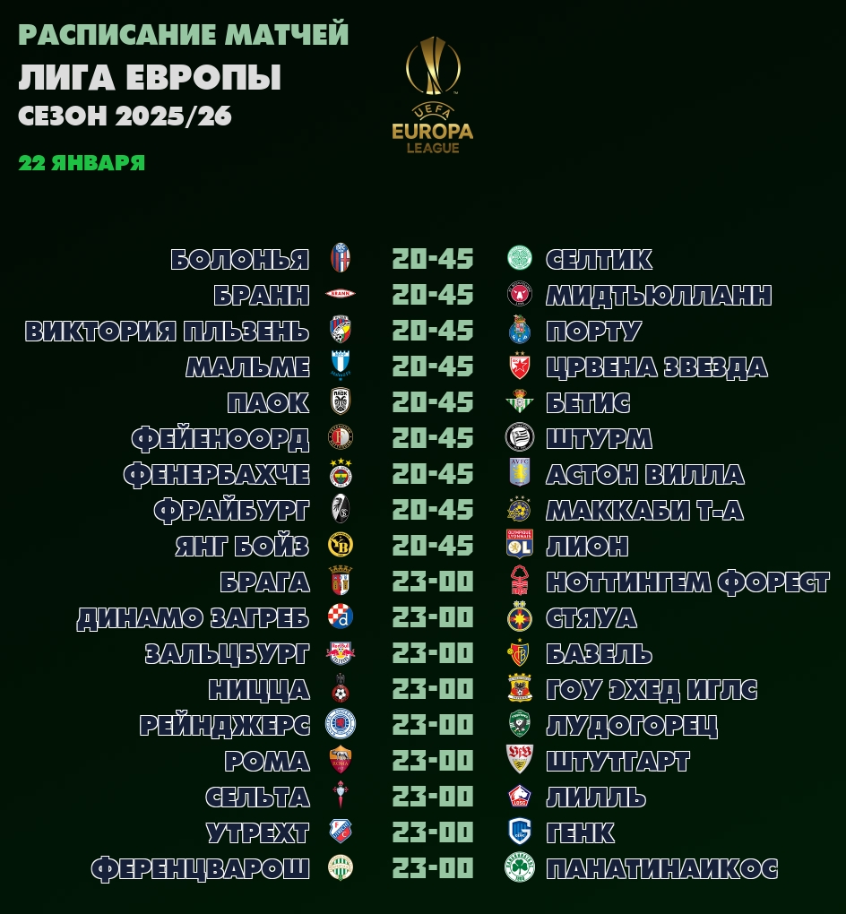 22 января 📺 ближайшие трансляции Лиги Европы: ✔20-45 Болонья - Селтик, ✔20-45 Бранн - Мидтьюлланн, ✔20-45 Виктория Пльзень - Порту, ✔20-45 Мальме - Црвена Звезда...