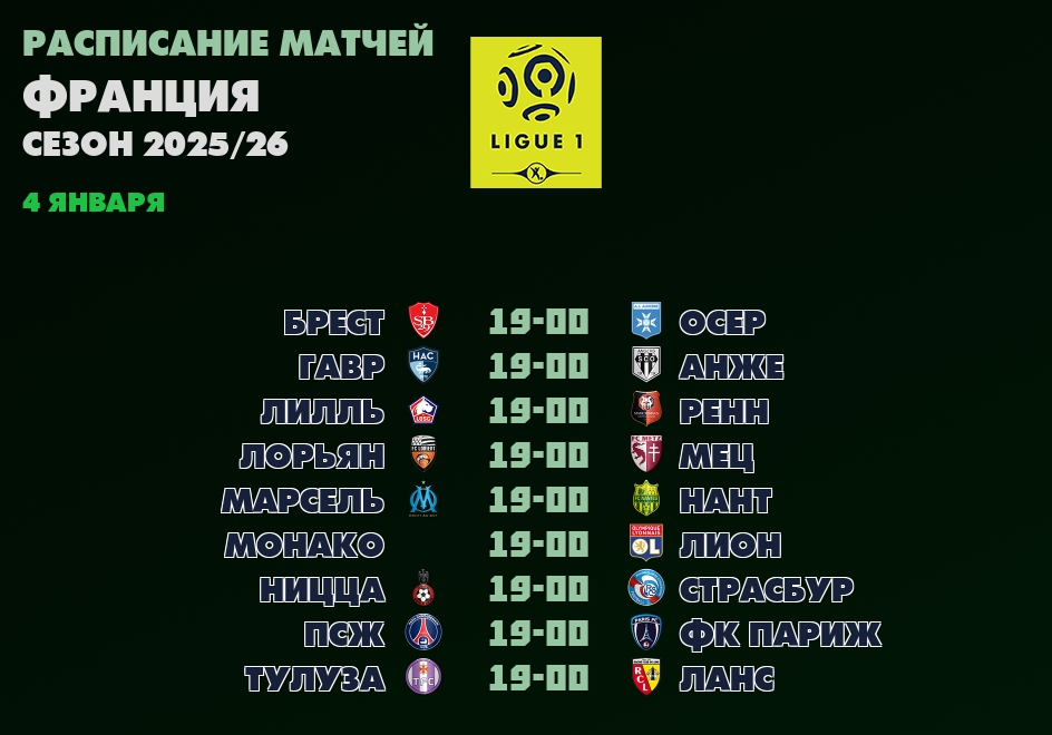 4 января 📺 ближайшие трансляции Лиги 1 чемпионата Франция: ✔19-00 Брест - Осер, ✔19-00 Гавр - Анже, ✔19-00 Лилль - Ренн, ✔19-00 Лорьян - Мец...