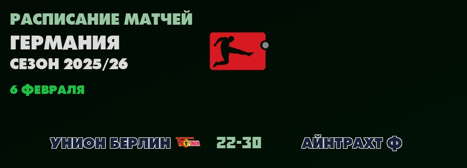 7 февраля 📺 ближайшие трансляции Бундеслиги Германии: ✔22-30 Унион Берлин - Айнтрахт Ф, ✔17-30 Вольфсбург - Боруссия Д, ✔17-30 Майнц - Аугсбург, ✔17-30 Санкт-Паули - Штутгарт...