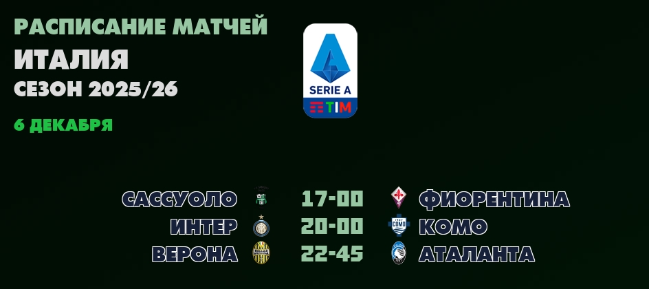 7 декабря 📺 ближайшие трансляции Серии А чемпионата Италии: ✔17-00 Сассуоло - Фиорентина, ✔20-00 Интер - Комо, ✔22-45 Верона - Аталанта, ✔14-30 Кремонезе - Лечче...