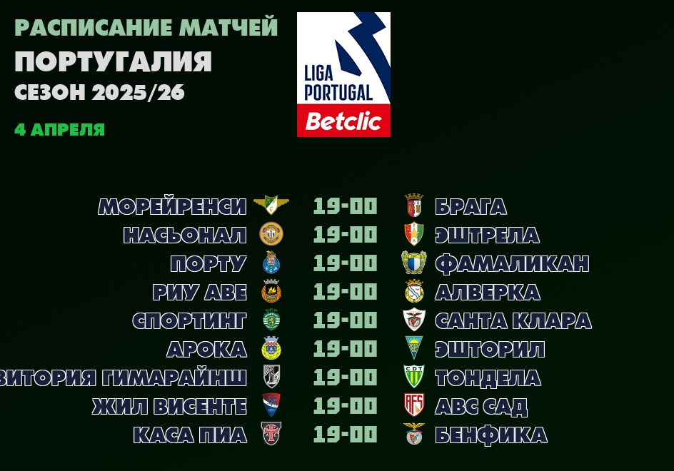 4 апреля 📺 ближайшие трансляции Примейра-лиги Португалии: ✔19-00 Морейренси - Брага, ✔19-00 Насьонал - Эштрела, ✔19-00 Порту - Фамаликан, ✔19-00 Риу Аве - Алверка...