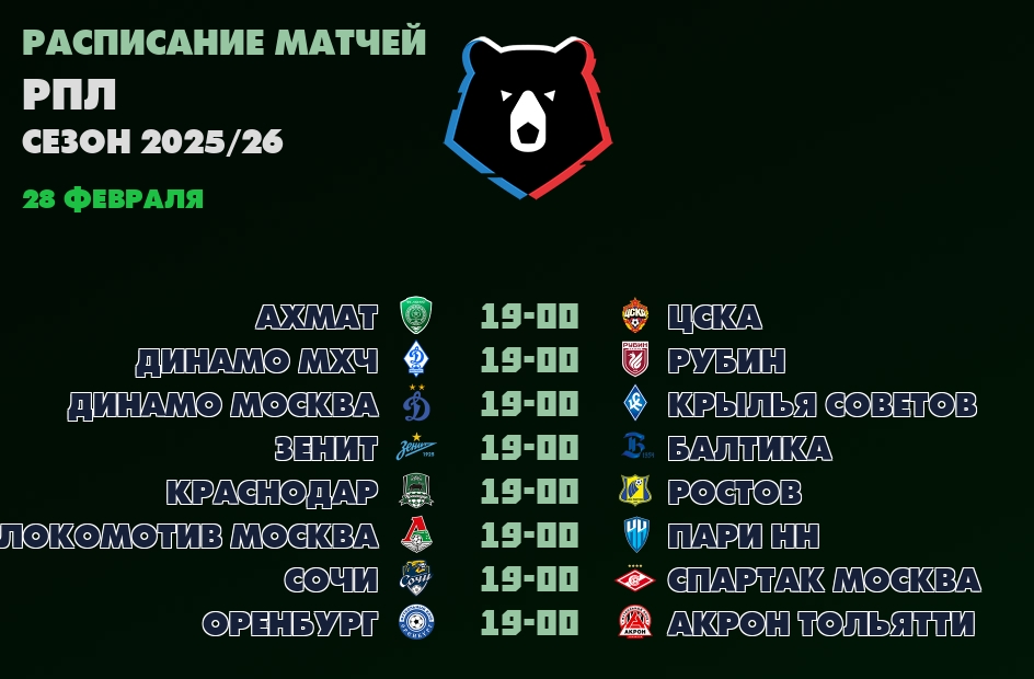 28 февраля 📺 ближайшие трансляции чемпионата РПЛ: ✔19-00 Ахмат - ЦСКА, ✔19-00 Динамо Махачкала - Рубин, ✔19-00 Динамо Москва - Крылья Советов, ✔19-00 Зенит - Балтика...