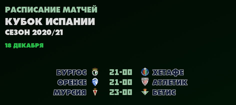Сегодня, 18 декабря 📺 прямые трансляции Кубка Испании: ✔21-00 Бургос - Хетафе, ✔21-00 Оренсе - Атлетик, ✔23-00 Мурсия - Бетис...
