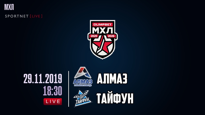 29 ноября 2019 года, состоялась онлайн трансляция хоккейного матча между хоккейным клубом Алмаз и хоккейным клубом Тайфун, проходящего в рамках чемпионата МХЛ.