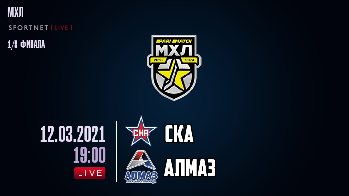 12 марта 2021 года, состоялась онлайн трансляция хоккейного матча между хоккейным клубом СКА и хоккейным клубом Алмаз, проходящего в рамках чемпионата МХЛ.