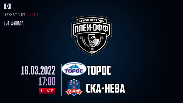 16 марта 2022 года, состоялась онлайн трансляция хоккейного матча между хоккейным клубом Торос и хоккейным клубом СКА-Нева, проходящего в рамках чемпионата ВХЛ.