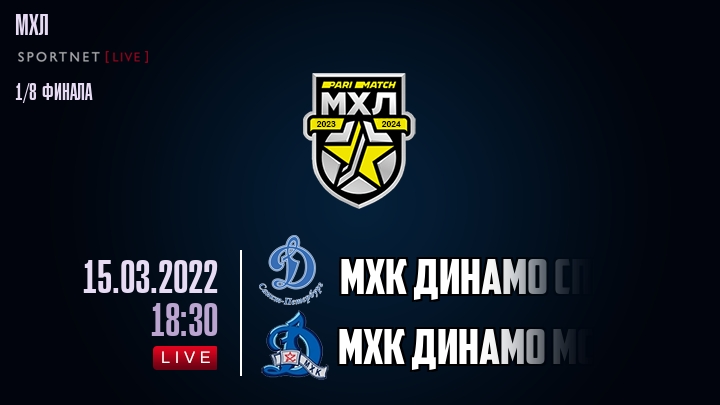 15 марта 2022 года, состоялась онлайн трансляция хоккейного матча между хоккейным клубом МХК Динамо Спб и хоккейным клубом МХК Динамо Мск, проходящего в рамках чемпионата МХЛ.