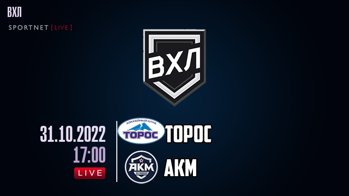 31 октября 2022 года, состоялась онлайн трансляция хоккейного матча между хоккейным клубом Торос и хоккейным клубом АКМ, проходящего в рамках чемпионата ВХЛ.