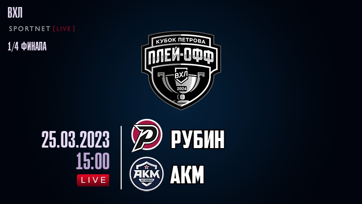 25 марта 2023 года, состоялась онлайн трансляция хоккейного матча между хоккейным клубом Рубин и хоккейным клубом АКМ, проходящего в рамках чемпионата ВХЛ.
