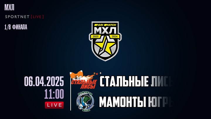 6 апреля 2025 года, состоялась онлайн трансляция хоккейного матча между хоккейным клубом Стальные Лисы и хоккейным клубом Мамонты Югры, проходящего в рамках чемпионата МХЛ.