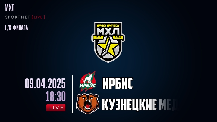 9 апреля 2025 года, состоялась онлайн трансляция хоккейного матча между хоккейным клубом Ирбис и хоккейным клубом Кузнецкие Медведи, проходящего в рамках чемпионата МХЛ.