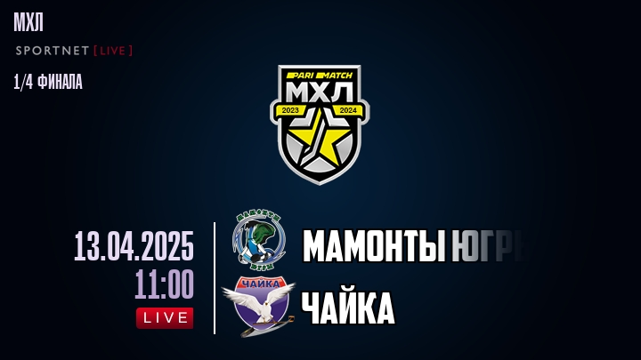 13 апреля 2025 года, состоялась онлайн трансляция хоккейного матча между хоккейным клубом Мамонты Югры и хоккейным клубом Чайка, проходящего в рамках чемпионата МХЛ.