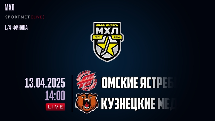 13 апреля 2025 года, состоялась онлайн трансляция хоккейного матча между хоккейным клубом Омские Ястребы и хоккейным клубом Кузнецкие Медведи, проходящего в рамках чемпионата МХЛ.