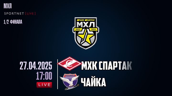 27 апреля 2025 года, состоялась онлайн трансляция хоккейного матча между хоккейным клубом МХК Спартак и хоккейным клубом Чайка, проходящего в рамках чемпионата МХЛ.