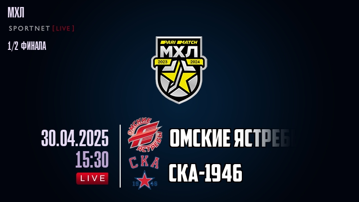 30 апреля 2025 года, состоялась онлайн трансляция хоккейного матча между хоккейным клубом Омские Ястребы и хоккейным клубом СКА-, проходящего в рамках чемпионата МХЛ.