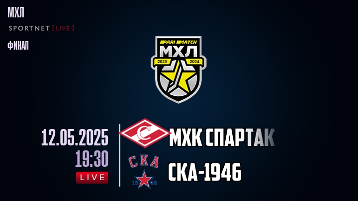 12 мая 2025 года, состоялась онлайн трансляция хоккейного матча между хоккейным клубом МХК Спартак и хоккейным клубом СКА-, проходящего в рамках чемпионата МХЛ.