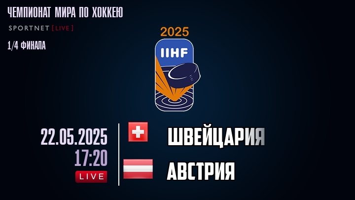 22 мая 2025 года, состоялась онлайн трансляция хоккейного матча между сборной Швейцарии и сборной Австрии, проходящего в рамках Серии 1/4 финала ПЛЕЙ-ОФФ Чемпионата мира по хоккею.