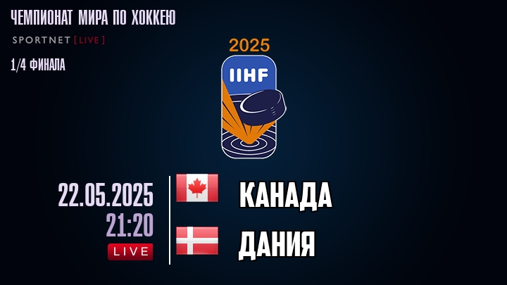 22 мая 2025 года, состоялась онлайн трансляция хоккейного матча между сборной Канады и сборной Дании, проходящего в рамках Серии 1/4 финала ПЛЕЙ-ОФФ Чемпионата мира по хоккею.