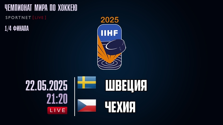 22 мая 2025 года, состоялась онлайн трансляция хоккейного матча между сборной Швеции и сборной Чехии, проходящего в рамках Серии 1/4 финала ПЛЕЙ-ОФФ Чемпионата мира по хоккею.