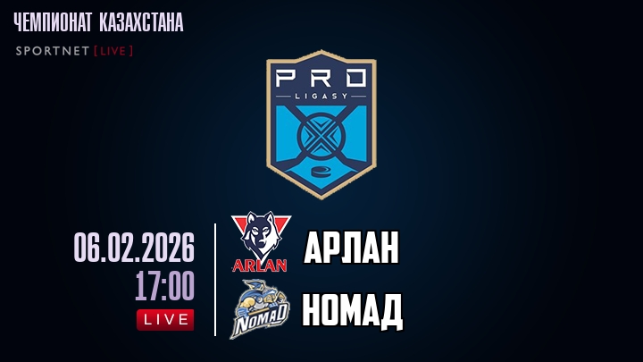 6 февраля 2026 года, мы предлагаем посмотреть онлайн трансляцию хоккейного матча между хоккейным клубом Арлан и хоккейным клубом Номад, проходящего в рамках чемпионата Казахстана.