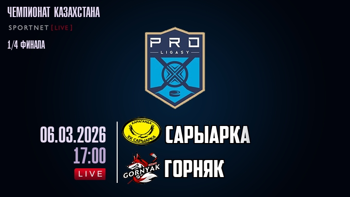 Сегодня, 6 марта 2026 года, мы предлагаем посмотреть онлайн трансляцию хоккейного матча между хоккейным клубом Сарыарка и хоккейным клубом Горняк, проходящего в рамках Серии 1/4 финала ПЛЕЙ-ОФФ чемпионата Казахстана.
