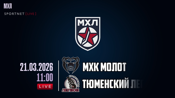 Сегодня, 21 марта 2026 года, состоялась онлайн трансляция хоккейного матча между хоккейным клубом МХК Молот и хоккейным клубом Тюменский Легион, проходящего в рамках чемпионата МХЛ.