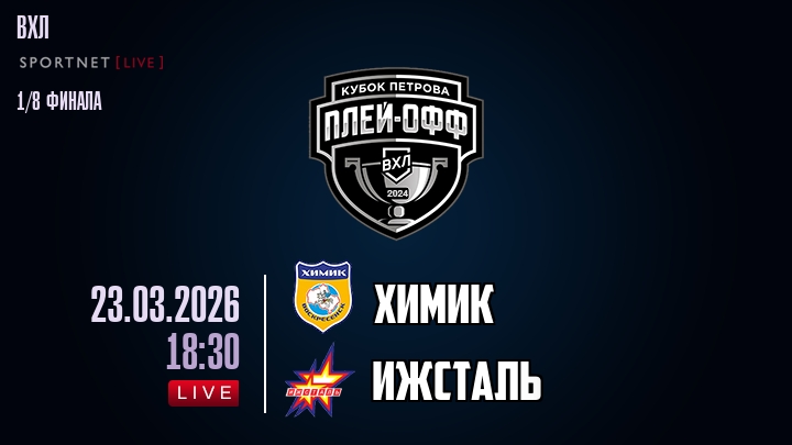 23 марта 2026 года, мы предлагаем посмотреть онлайн трансляцию хоккейного матча между хоккейным клубом Химик и хоккейным клубом Ижсталь, проходящего в рамках чемпионата ВХЛ.