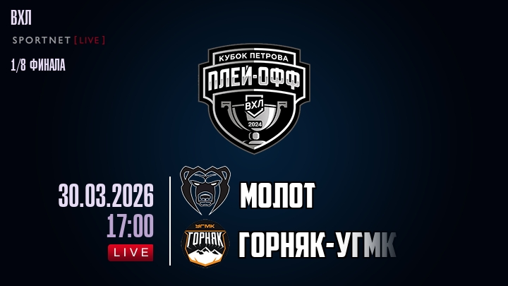 30 марта 2026 года, мы предлагаем посмотреть онлайн трансляцию хоккейного матча между хоккейным клубом Молот и хоккейным клубом Горняк-УГМК, проходящего в рамках Серии 1/8 финала ПЛЕЙ-ОФФ чемпионата ВХЛ.